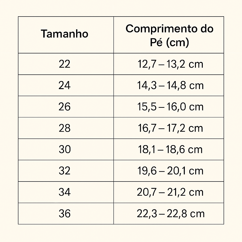👉 Para garantir o ajuste correto, recomendamos a consulta da tabela de tamanhos, de forma a escolher o tamanho mais adequado ao pé da sua criança e assegurar o máximo conforto.